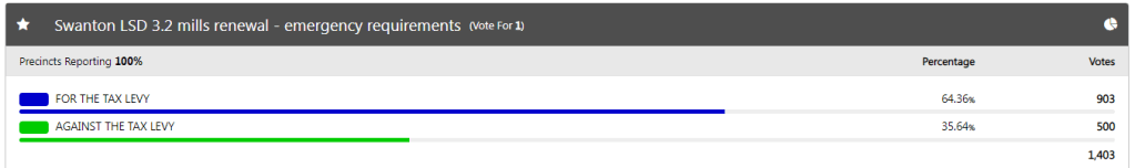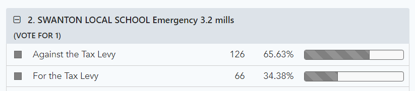 Unofficially, of course, it looks like the Swanton Local School Emergency Renewal Levy has passed with 969 For votes and 626 Against votes. Voters in Fulton County stepped up in a big way voting for 903-500, exceeding the November turnout by almost 300 votes. Lucas County voters carried on their tradition of voting down school levies, this time by a 2-1 margin.