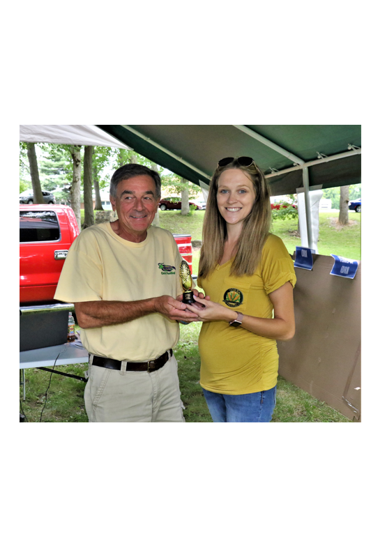 Pictured: Alyssa Walberg hands the Swanton Jeopardy trophy to winner Bob Wertz, now recognized as the smartest man in Swanton.
