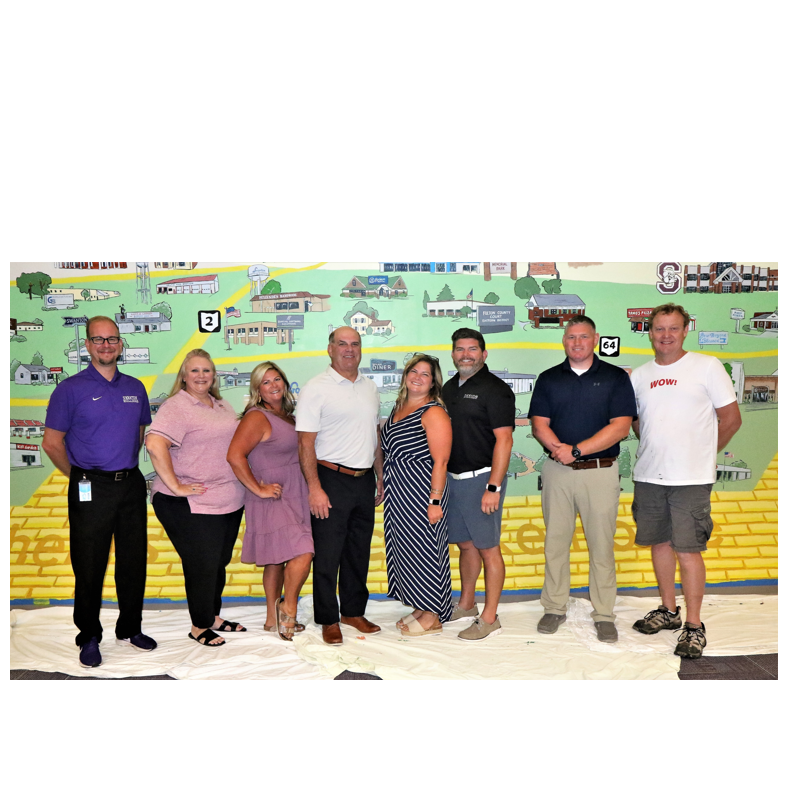 Photo: (L to R) Chris Lake (Swanton Schools Superintendent), Cara Leininger (Ohio Means Jobs Supervisor), Leigh Pancoast (Swanton Middle School Principal), Mike Remer (SMS Career Coach), Ashley Stambaugh (EMIS Coordinator), Ben Remer (Swanton Board of Education President), Matt Horen (SMS Assistant Principal), Dave Rickerd (Mural Artist)