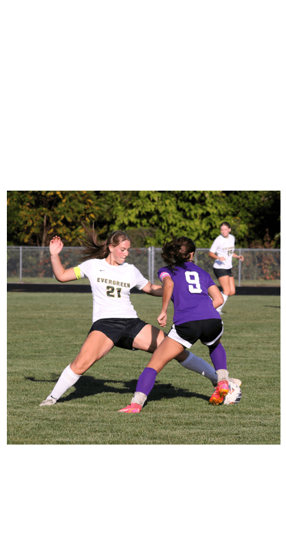 Photo: Evergreen’s Reagan Radel (21) mixes it up with Swanton’s Miranda Yeager (9)