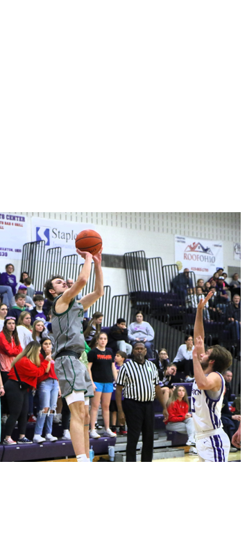 Photo: Evergreen’s Eli Kiefer shoots a fade-away jumper over Swanton’s Logan Young for two of his 14 game-high points