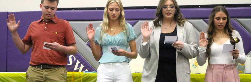 Treasurer Makaila Levin introduced new Treasure Ben Heckert, Secretary Marlee Purdy introduced new Secretary Jessica Finfera, Vice-President Faith Butler introduced new Vice-President Makenna Mortimore, President Sydney Ruiz introduced and passed the gavel to new President Keagan Young. Also introduced were 15 members from the Class of 2025 and 28 new members.