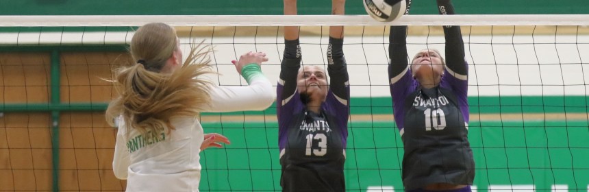 Photo: Swanton’s Anja Caklovic and Zara Wylie block a spike attempt by Delta’s Addison Wyse
