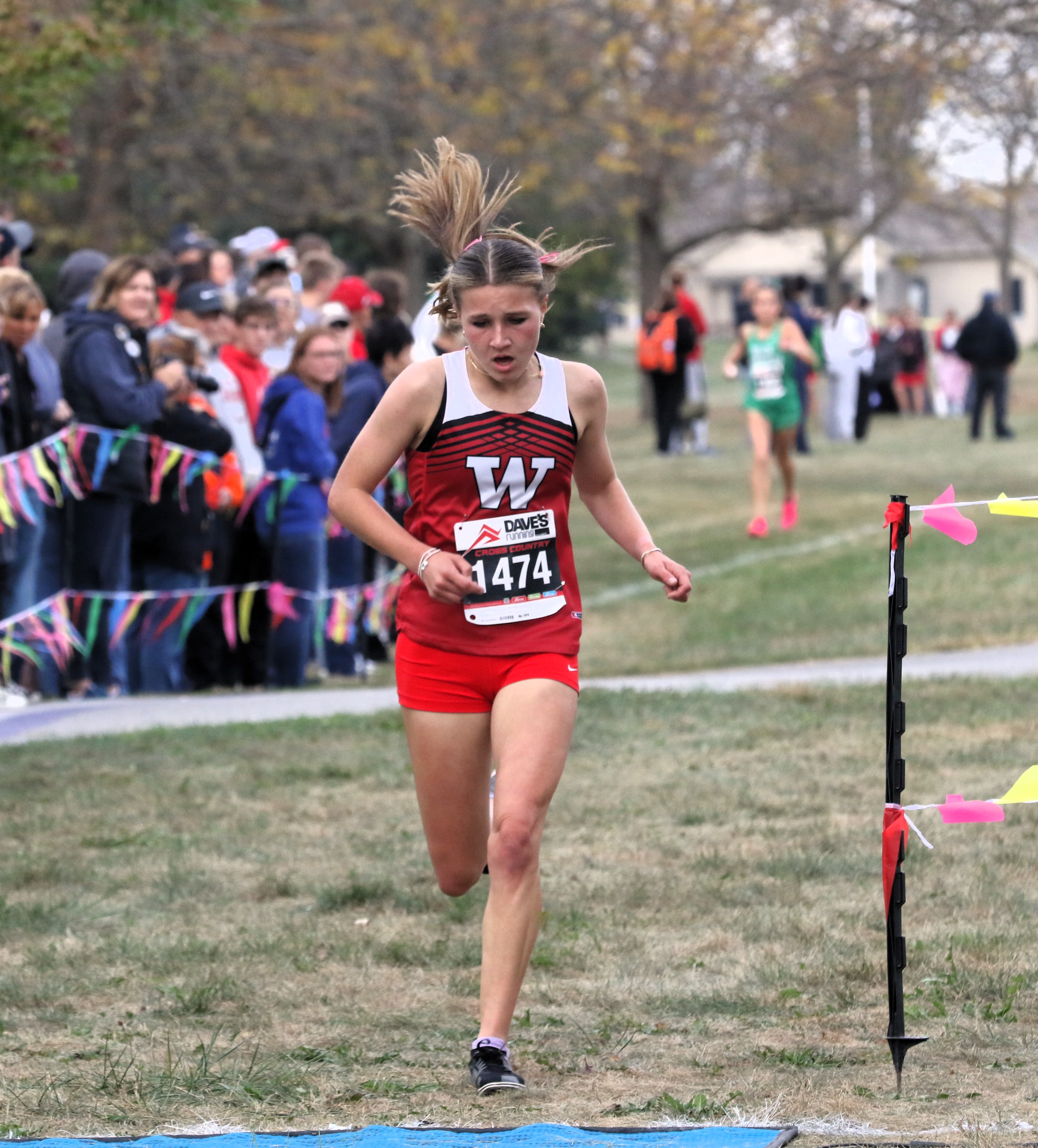 Photo: Ella Rhoades crosses the finish line to win the Girls NWOAL Cross Country Championship
