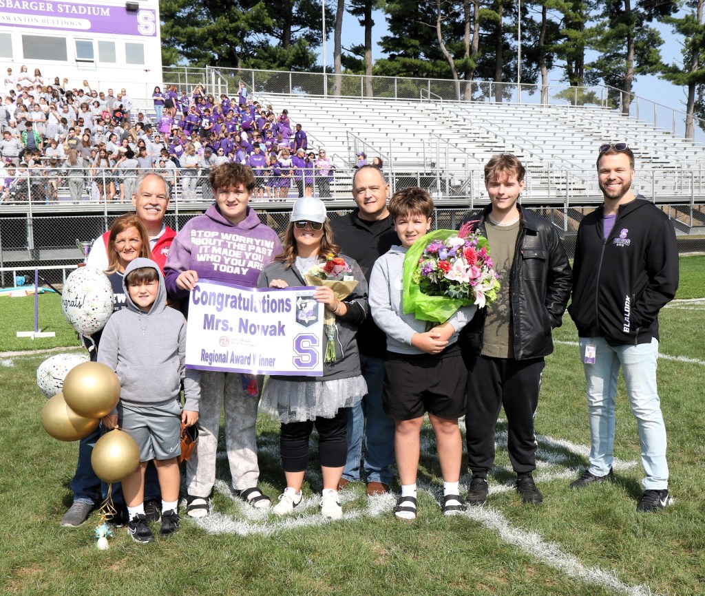 Angela Nowak, a 5th-Grade English Language Arts teach at Swanton Middle School (SMS), has been given an award for Regional Teacher Recognition for Excellence from Ohio Middle Level Association (OMLA) Northwest Region.  Winners are nominated educators that have been found to promote middle school concepts through involvement in exemplary programs, leadership or research that serves the needs of middle level students.  The announcement was made by SMS Principal Nicolette Starks following the Swanton Seven Initiative “House Reveal” celebration held on the school’s football field last Friday morning.
