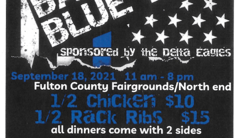 With the success of last year’s event, the Delta Eagles have decided to do it again. The second “Back the Blue” event will take place on September 18, 2021 from 11:00 AM until 8:00 PM or until all the dinners are sold. Patrons will have their choice of a Half-Chicken dinner with potato salad and a roll for $10 or a Half-Rack Ribs dinner with baked beans and a roll for $15. There will also be a 50/50 drawing held at approximately 8:00 PM on the same night and tickets, $5 each or five for $20, can be purchased at the Sheriff’s Office, the local police departments or at the Fair Grounds the day of the event.